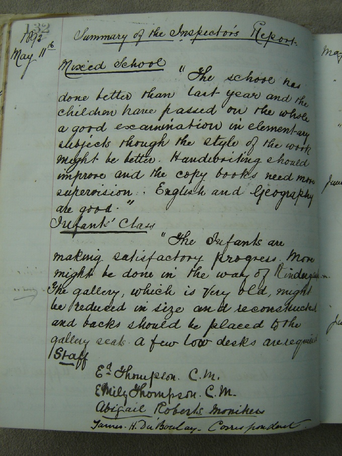 Govt. Report received this morning. (In these days the school was inspected annually. Summaries of the reports were entered into the log each year. The school’s funds depended on the outcome of these inspections.)