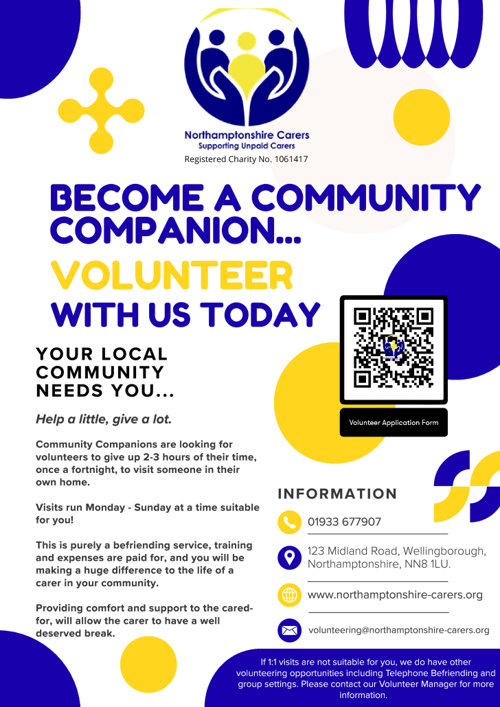 Northamptonshire Carers are currently looking for volunteers to help unpaid carers across Northamptonshire in various ways, including Long-term Health Condition Support groups, Carers Information and Wellbeing Hubs, Parent Carer support groups, Walk & Talk groups, Young Carers groups, Community Companion (providing friendship and respite), and Telephone befriending. These roles involve offering a warm welcome, engaging in friendly conversation, and providing general support to carers attending the sessions.
