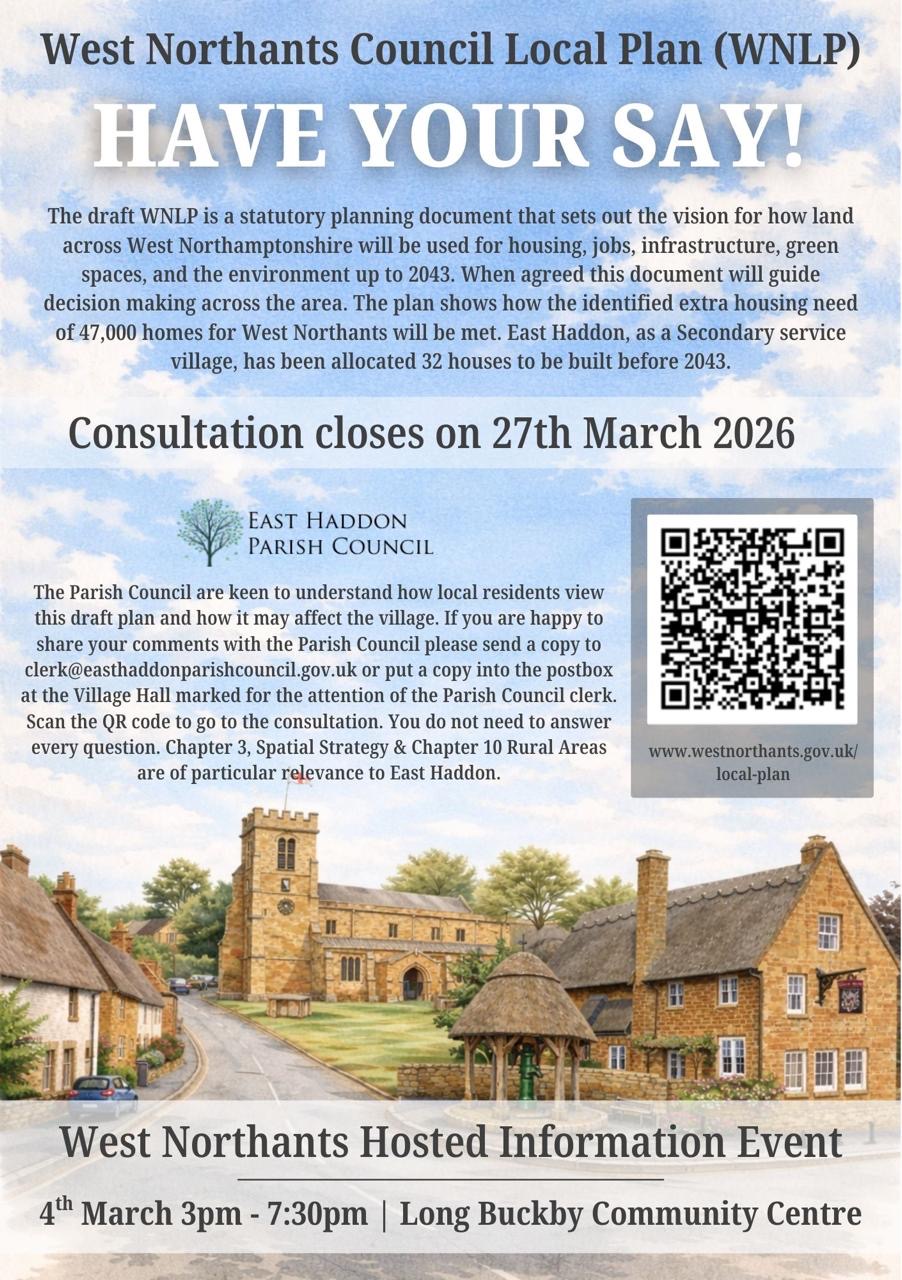 https://www.easthaddonparishcouncil.gov.uk/wp-content/uploads/2026/02/Local-Plan-Leaflet-1.jpeg1280902Clerkhttps://www.easthaddonparishcouncil.gov.uk/wp-content/uploads/2022/12/east-haddon-parish-council-logo.pngClerk2026-02-24 10:46:222026-02-24 10:46:22Draft Local Plan Consultation - Deadline 27.3.26