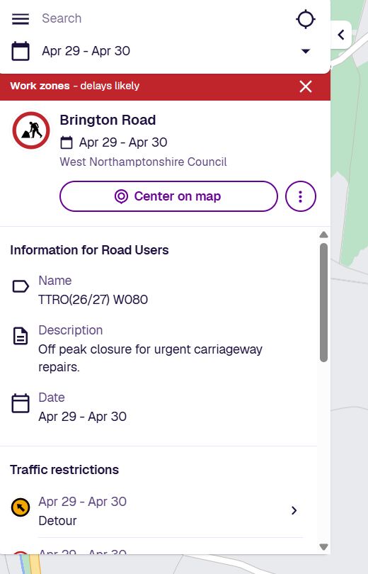 The closure and diversion can be viewed here https://one.network/?tm=GB149618550